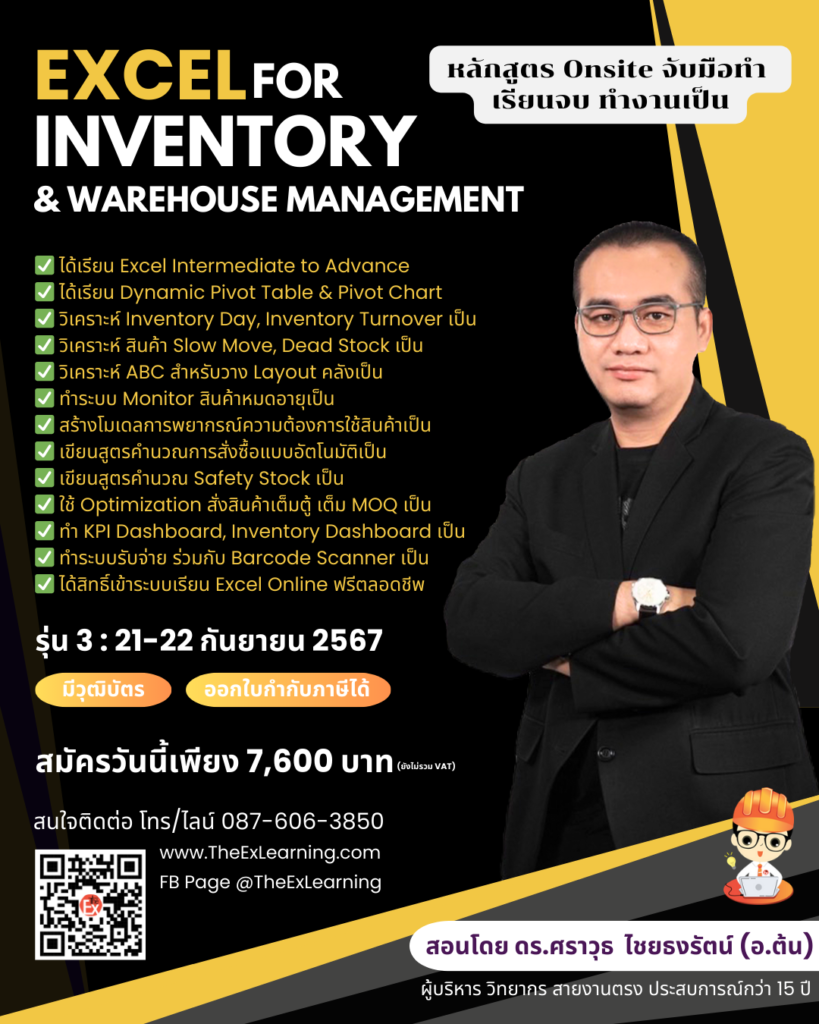 จะดีไหมถ้ามีหลักสูตรที่เรียนแล้วทำงานเป็น ซึ่งส่วนใหญ่เวลาเรียนหรืออบรม ภาคทฤษฎีไป เรียนจบไม่รู้จะเริ่มอย่างไร ทำอย่างไร หลักสูตรนี้ออกแบบมาเพื่อคนทำงาน หรือผู้สนใจในสายงาน Logistics, Supply Chain, Planning, Inventory, Warehouse, Purchasing จากประสบการณ์และการทำงานจริงของวิทยากรกว่า 15 ปี ผสมผสานทั้งทฤษฎี วิธีปฏิบัติ กลั่นกรองเป็นเทคนิค วิธีการ กลายเป็นหลักสูตรที่ สอนตั้งแต่พื้นฐาน จนถึงการนำไปประยุกต์ใช้งานจริง ด้วย Microsoft Excel โปรแกรมที่ทุกคนต้องใช้และต้องเป็นสำหรับคนทำงาน